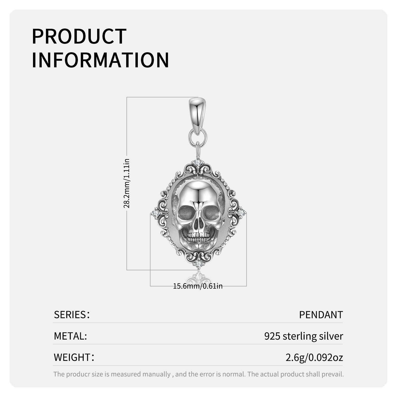 S925 Sterling Silver Fine Relief Skull Portrait Pendant